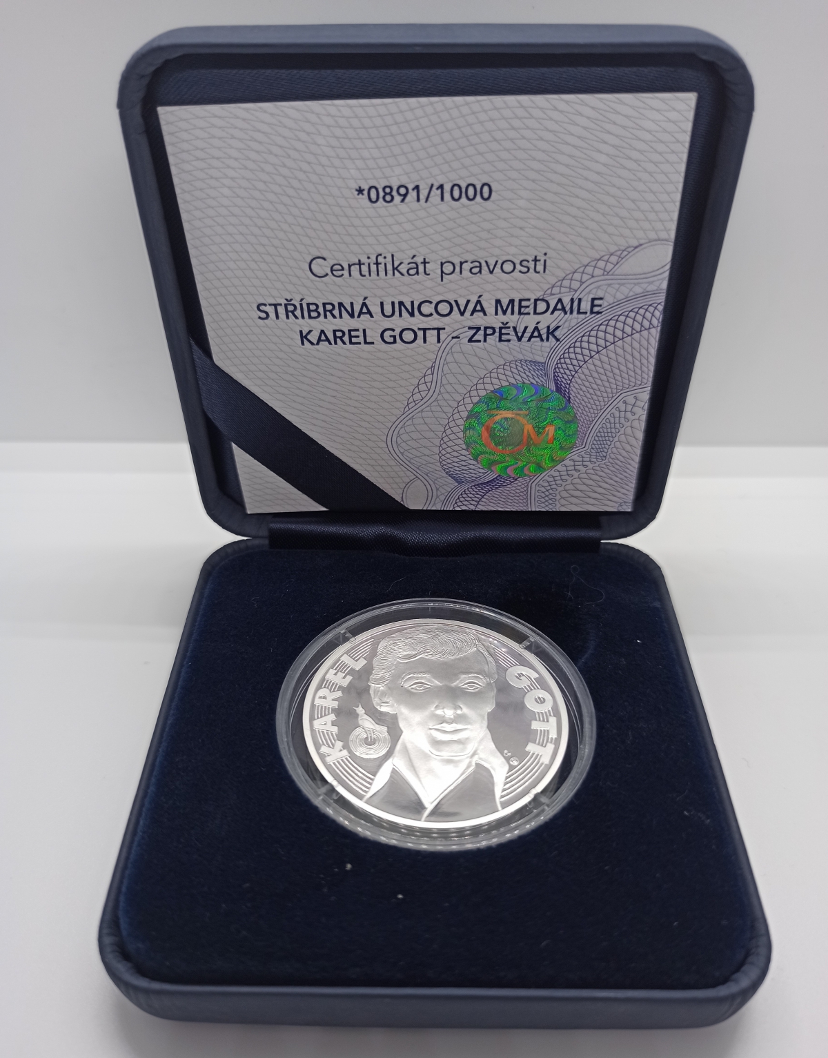 Stříbrná investiční uncová medaile s motivem Karel Gott jako zpěvák. Další stříbrnou medaili naleznete zde . S certifikátem pravosti. Emise 1000ks.