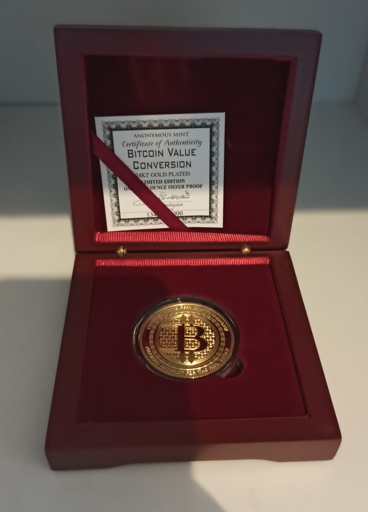 Popis:Bitcoin stříbrná mince 1 oz pozlacený v boxu