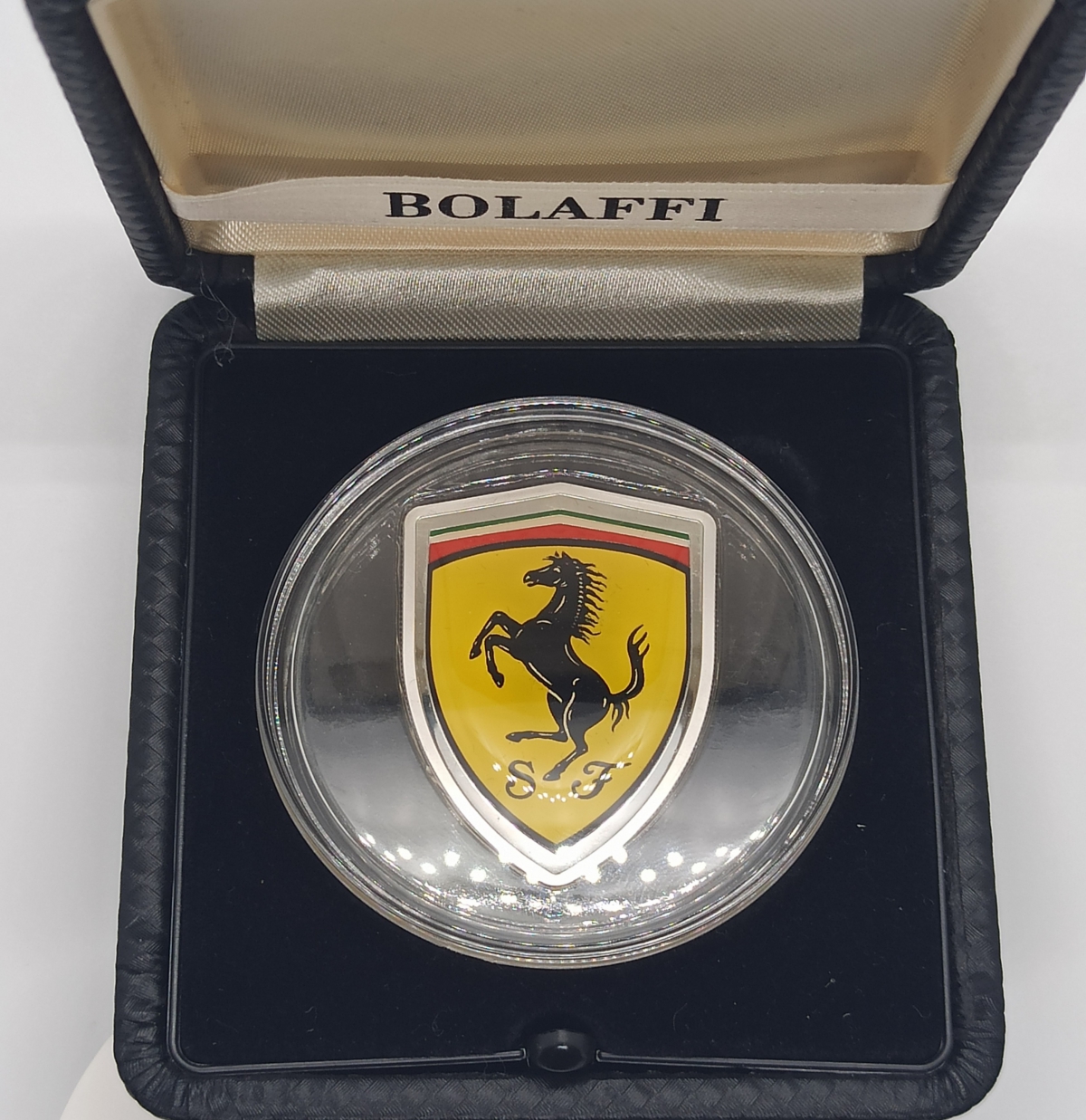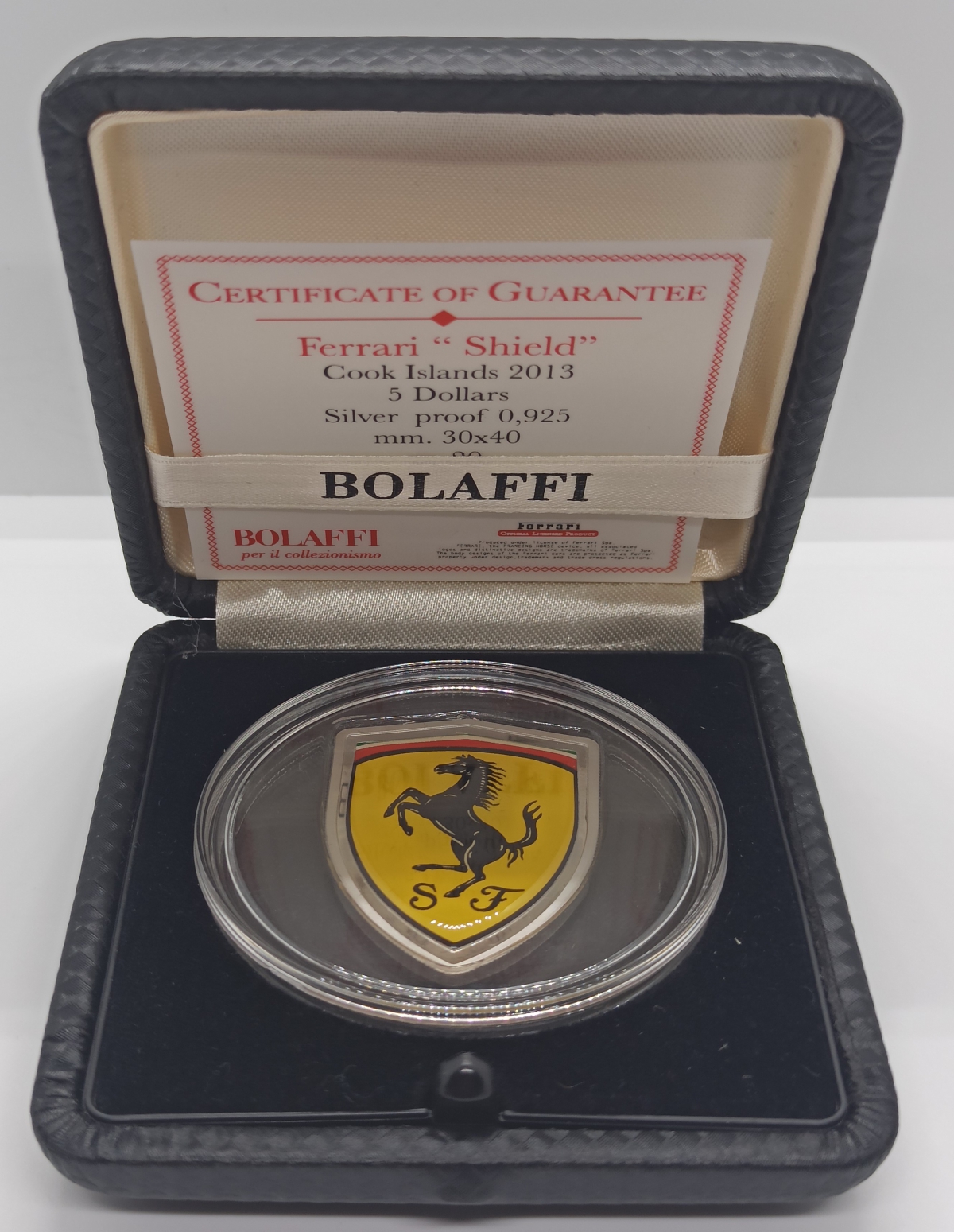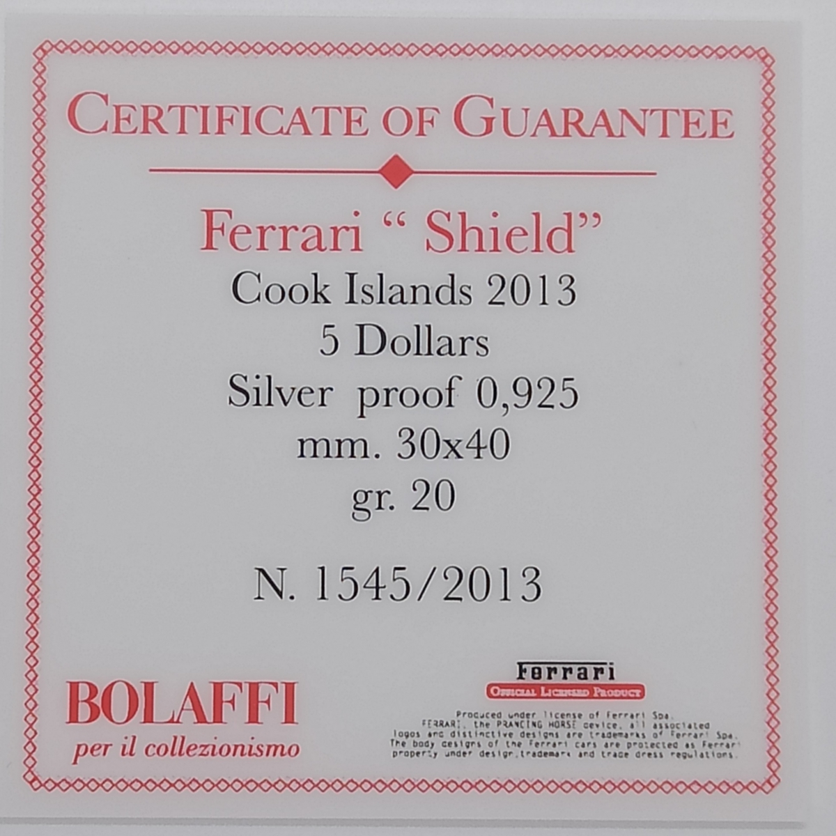 Stříbrná 20ti gramová medaile Shield od Ferrari. Mince byla ražena v roce 2013 s celkovým počtem 2013 kusů. Medaile je dodávána v boxu s certifikátem pravosti.